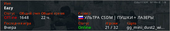 Играет на Counter Strike 1.6 сервере. Страна: РоссияПервый раз замечен 11:09 17.08.2025