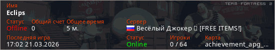 Играет на Team Fortress 2 сервере. Страна: РоссияПервый раз замечен 16:48 21.03.2026