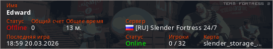 Играет на Team Fortress 2 сервере. Страна: РоссияПервый раз замечен 18:33 20.03.2026