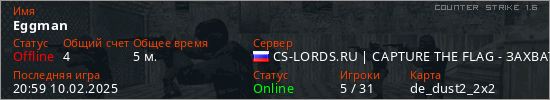 Играет на Counter Strike 1.6 сервере. Страна: РоссияПервый раз замечен 20:54 10.02.2025