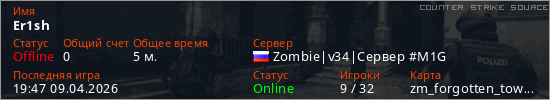 Играет на Counter Strike Source сервере. Страна: РоссияПервый раз замечен 19:24 09.04.2026