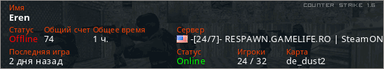 Играет на Counter Strike 1.6 сервере. Страна: СШАПервый раз замечен 08:04 15.03.2025
