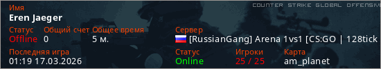 Играет на Counter Strike Global Offensive сервере. Страна: РоссияПервый раз замечен 01:09 17.03.2026