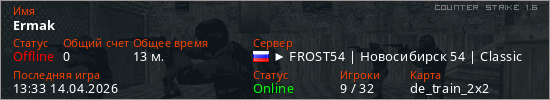 Играет на Counter Strike 1.6 сервере. Страна: РоссияПервый раз замечен 09:32 13.04.2026