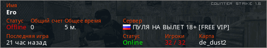 Играет на Counter Strike 1.6 сервере. Страна: РоссияПервый раз замечен 21:23 07.12.2025