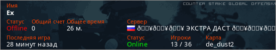 Играет на Counter Strike Global Offensive сервере. Страна: РоссияПервый раз замечен 17:31 09.04.2026