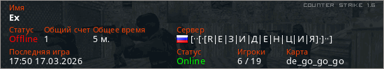 Играет на Counter Strike 1.6 сервере. Страна: РоссияПервый раз замечен 17:48 17.03.2026