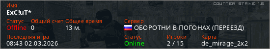 Играет на Counter Strike 1.6 сервере. Страна: РоссияПервый раз замечен 18:21 28.02.2026