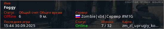 Играет на Counter Strike Source сервере. Страна: РоссияПервый раз замечен 16:06 26.09.2025