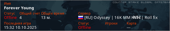 Играет на Counter Strike Global Offensive сервере. Страна: РоссияПервый раз замечен 17:05 15.09.2025