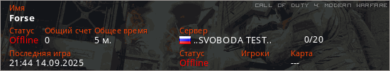 Играет на Call of Duty 4: Modern Warfare сервере. Страна: РоссияПервый раз замечен 21:42 14.09.2025