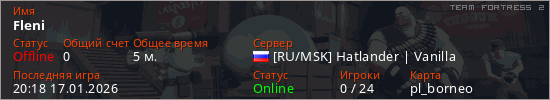 Играет на Team Fortress 2 сервере. Страна: РоссияПервый раз замечен 20:16 17.01.2026