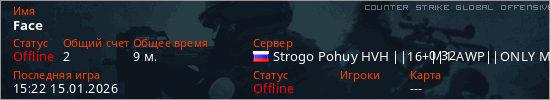 Играет на Counter Strike Global Offensive сервере. Страна: РоссияПервый раз замечен 20:26 14.01.2026