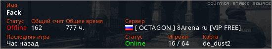 Играет на Counter Strike Source сервере. Страна: РоссияПервый раз замечен 02:50 15.08.2021