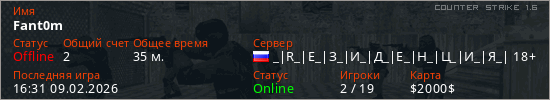 Играет на Counter Strike 1.6 сервере. Страна: РоссияПервый раз замечен 16:15 09.02.2026
