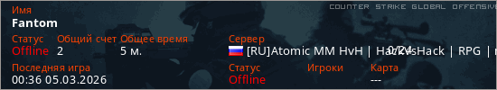 Играет на Counter Strike Global Offensive сервере. Страна: РоссияПервый раз замечен 00:26 05.03.2026