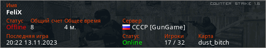 Играет на Counter Strike 1.6 сервере. Страна: РоссияПервый раз замечен 20:20 13.11.2023