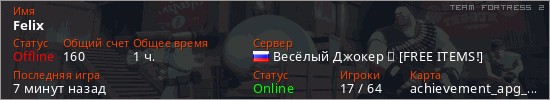 Играет на Team Fortress 2 сервере. Страна: РоссияПервый раз замечен 18:26 19.03.2026