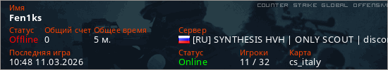 Играет на Counter Strike Global Offensive сервере. Страна: РоссияПервый раз замечен 10:46 11.03.2026