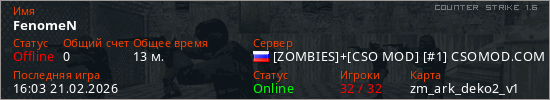 Играет на Counter Strike 1.6 сервере. Страна: РоссияПервый раз замечен 08:57 19.02.2026