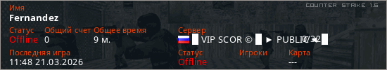 Играет на Counter Strike 1.6 сервере. Страна: РоссияПервый раз замечен 18:16 12.03.2026