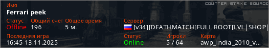 Играет на Counter Strike Source сервере. Страна: РоссияПервый раз замечен 16:34 13.11.2025