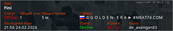 Играет на Counter Strike 1.6 сервере. Страна: РоссияПервый раз замечен 21:44 24.02.2026