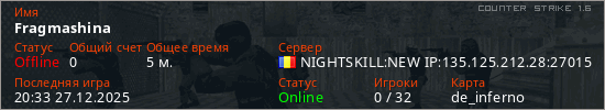 Играет на Counter Strike 1.6 сервере. Страна: РумынияПервый раз замечен 20:31 27.12.2025
