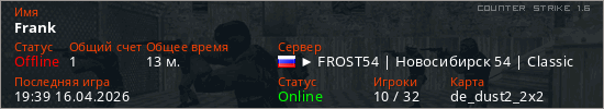 Играет на Counter Strike 1.6 сервере. Страна: РоссияПервый раз замечен 23:04 10.04.2026