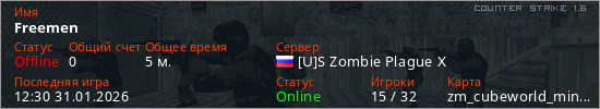 Играет на Counter Strike 1.6 сервере. Страна: РоссияПервый раз замечен 12:26 31.01.2026