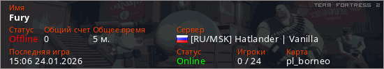 Играет на Team Fortress 2 сервере. Страна: РоссияПервый раз замечен 14:59 24.01.2026