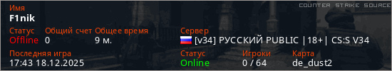 Играет на Counter Strike Source сервере. Страна: РоссияПервый раз замечен 15:36 18.12.2025