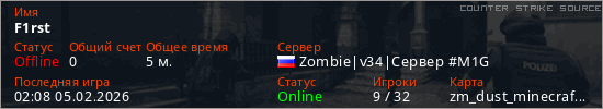 Играет на Counter Strike Source сервере. Страна: РоссияПервый раз замечен 02:06 05.02.2026