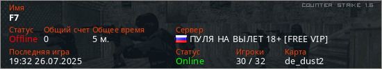 Играет на Counter Strike 1.6 сервере. Страна: РоссияПервый раз замечен 19:30 26.07.2025