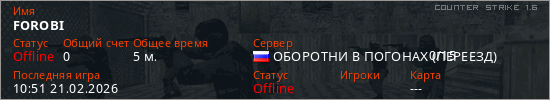 Играет на Counter Strike 1.6 сервере. Страна: РоссияПервый раз замечен 10:39 21.02.2026