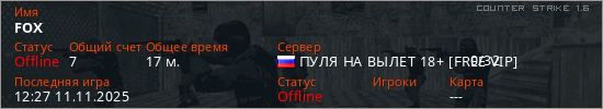 Играет на Counter Strike 1.6 сервере. Страна: РоссияПервый раз замечен 19:46 25.07.2025