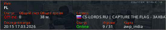 Играет на Counter Strike 1.6 сервере. Страна: РоссияПервый раз замечен 19:37 17.03.2026