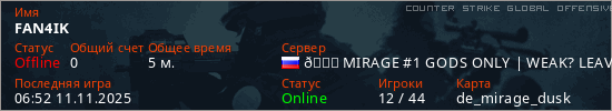 Играет на Counter Strike Global Offensive сервере. Страна: РоссияПервый раз замечен 06:45 11.11.2025