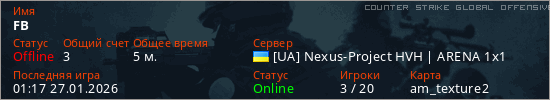 Играет на Counter Strike Global Offensive сервере. Страна: УкраинаПервый раз замечен 01:09 27.01.2026