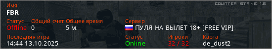 Играет на Counter Strike 1.6 сервере. Страна: РоссияПервый раз замечен 14:36 13.10.2025