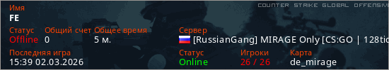 Играет на Counter Strike Global Offensive сервере. Страна: РоссияПервый раз замечен 15:21 02.03.2026