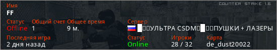 Играет на Counter Strike 1.6 сервере. Страна: РоссияПервый раз замечен 13:39 13.02.2026