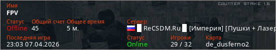 Играет на Counter Strike 1.6 сервере. Страна: РоссияПервый раз замечен 23:01 07.04.2026