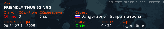 Играет на Counter Strike Global Offensive сервере. Страна: РоссияПервый раз замечен 20:19 27.11.2025