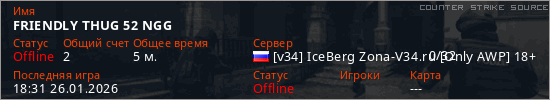 Играет на Counter Strike Source сервере. Страна: РоссияПервый раз замечен 18:10 26.01.2026