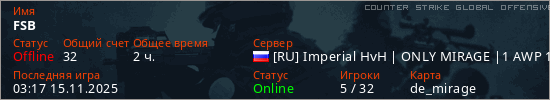 Играет на Counter Strike Global Offensive сервере. Страна: РоссияПервый раз замечен 00:08 26.09.2025