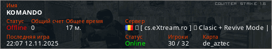 Играет на Counter Strike 1.6 сервере. Страна: РумынияПервый раз замечен 12:36 09.07.2025