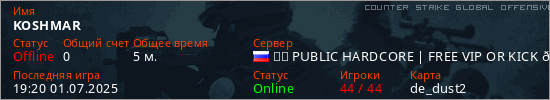 Играет на Counter Strike Global Offensive сервере. Страна: РоссияПервый раз замечен 19:01 01.07.2025