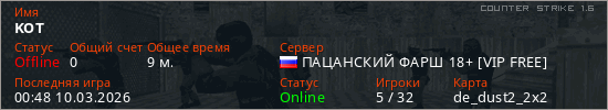 Играет на Counter Strike 1.6 сервере. Страна: РоссияПервый раз замечен 23:46 07.03.2026
