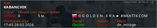 Играет на Counter Strike 1.6 сервере. Страна: РоссияПервый раз замечен 17:39 28.02.2026